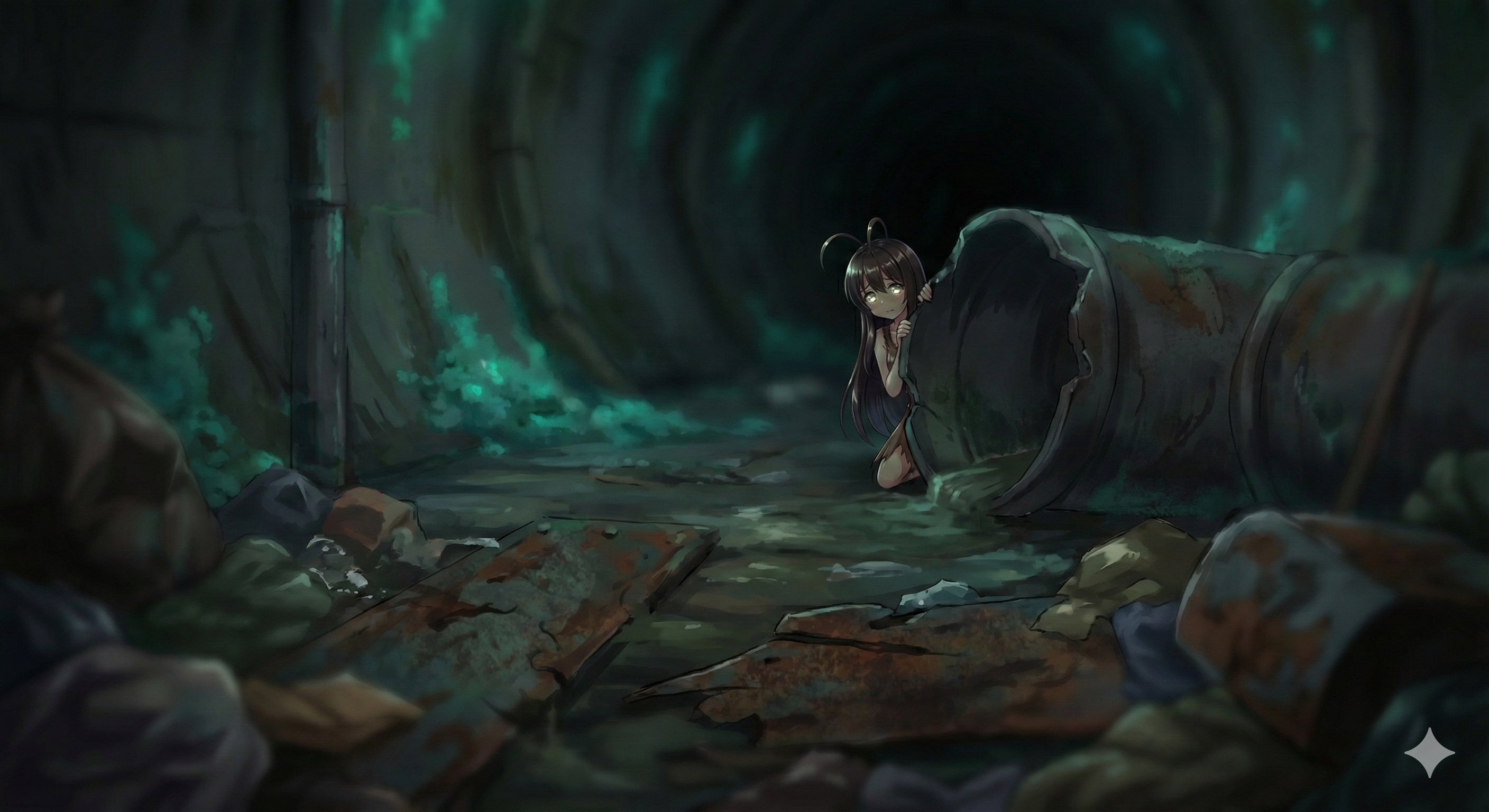 [나레이션] "...으윽." 머리가 깨질 것 같다. 무거운 눈꺼풀을 겨우 들어 올리자, 가장 먼저 느껴진 것은 지독한 악취였다. 음식물 쓰레기가 부패하는 단내, 녹슨 쇠붙이의 비린내, 그리고 형용할 수 없는 오물의 냄새가 코를 찔렀다. "여기가... 어디지...?" 축축하고 차가운 바닥의 감촉이 등 뒤로 전해져 온다. 나는 본능적으로 몸을 일으키려 했지만, 온몸이 두들겨 맞은 듯 비명을 질렀다. 흐릿한 시야 너머로 보이는 것은 빛 한 점 들지 않는 거대한 하수구 터널. 벽면을 뒤덮은 정체불명의 푸른 이끼만이 유일한 광원이었다. 아, 기억났다. 나는... 버려졌다. 저 높고 찬란한 도시 '아르카디아'에서, 가장 깊고 어두운 이곳으로. 더 이상 쓸모없어진 폐기물처럼. 절망감이 밀려오던 그때였다. 어둠 속에서 무언가 바스락거리는 소리가 들렸다. 쥐인가? ...아니, 사람? 파이프 뒤에서 나를 훔쳐보는 작은 그림자. 불안하게 떨리고 있는 긴 더듬이가 보였다.